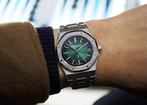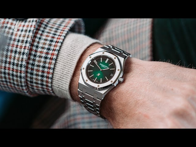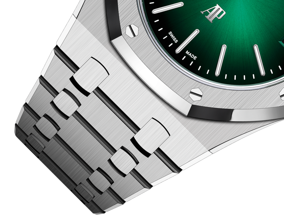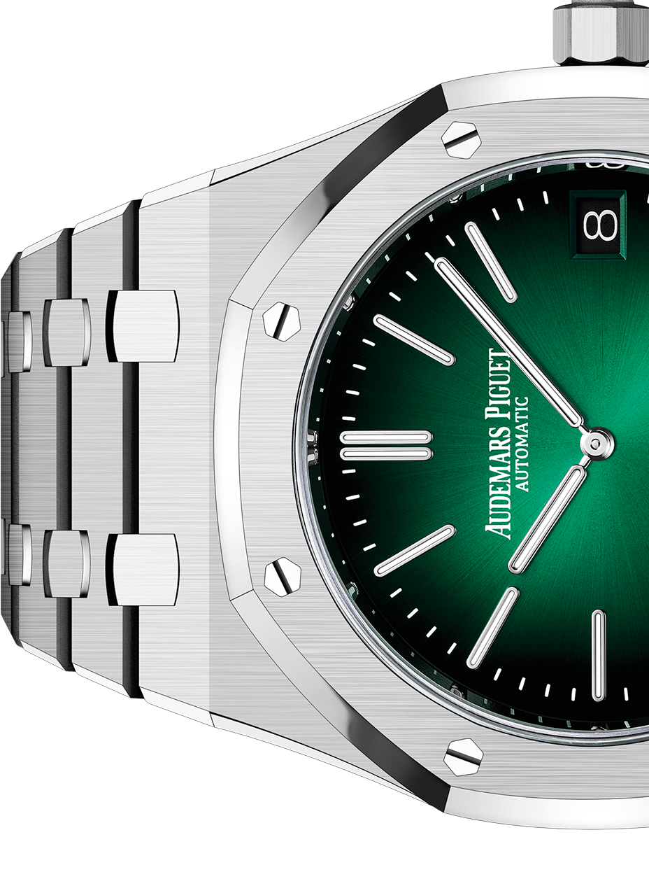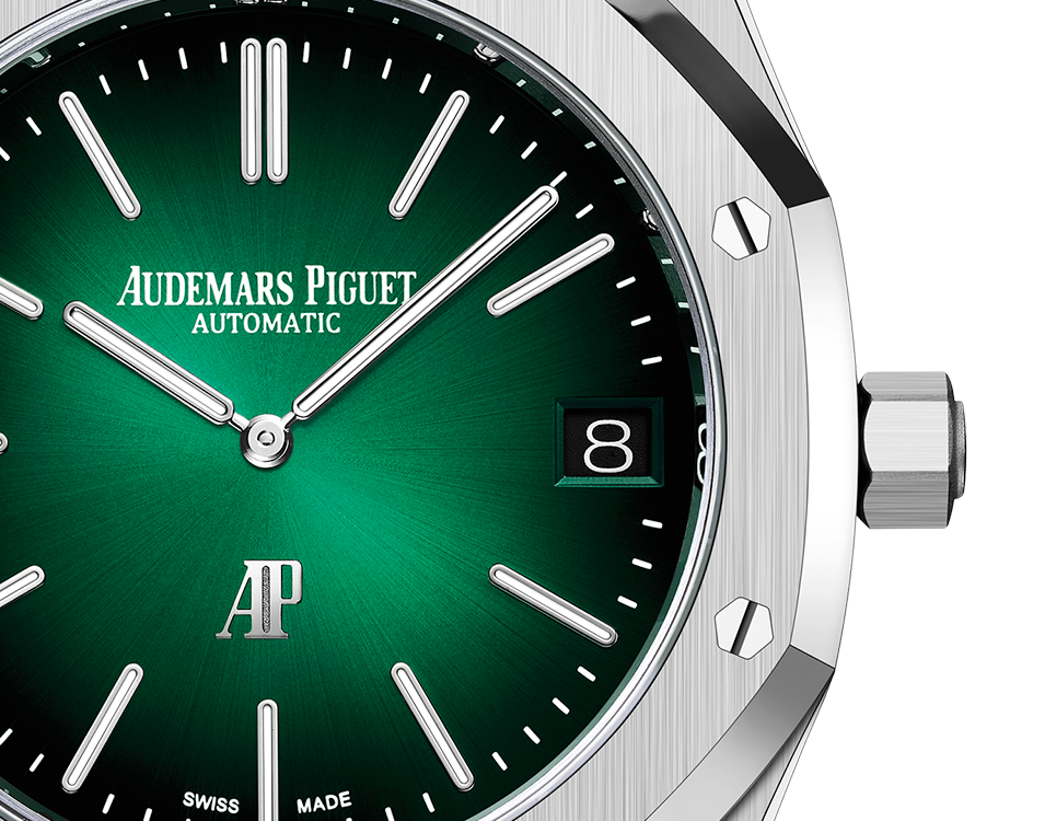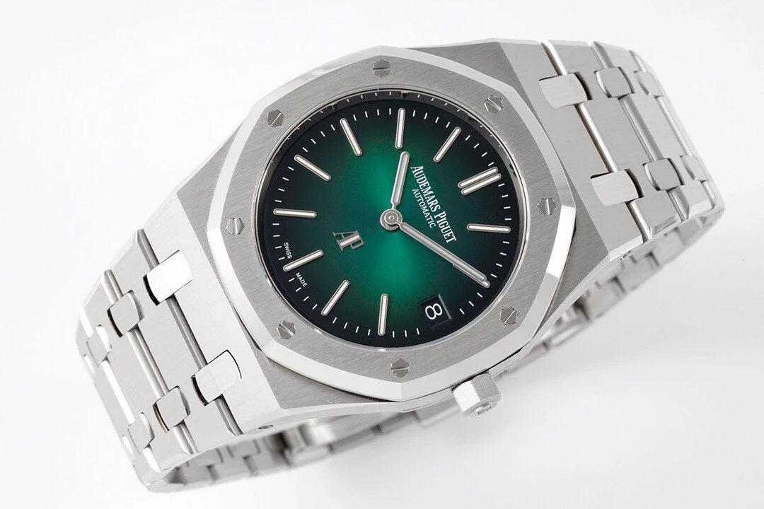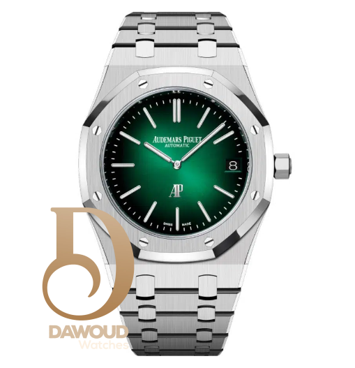 ساعة أوديمار بيغيه Audemars Piguet للرجال ميرور اوريجينال موديل Royal Oak 16202PT.OO.1240PT.01 لون اخضر و استيك معدن ستانلس لون فضي.