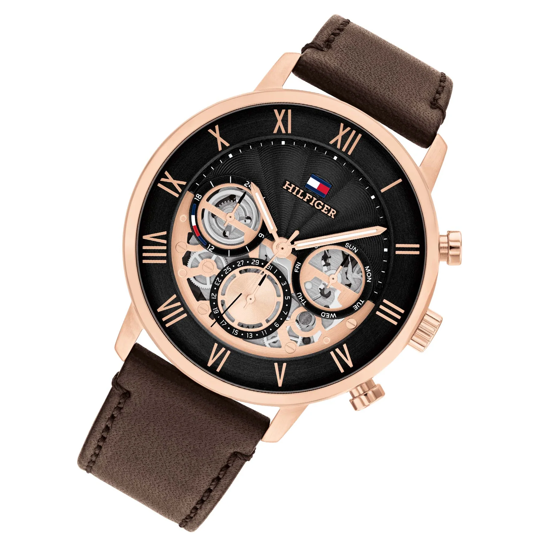 ساعة تومي هيلفيغر للرجال أصلية موديل 1710566 لون اسود و استيك جلد طبيعي لون بني.
