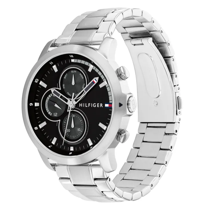ساعة تومي هيلفيغر للرجال أصلية موديل 1792048 لون اسود و استيك معدن ستانلس لون فضي.