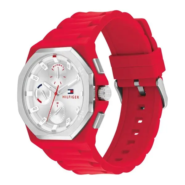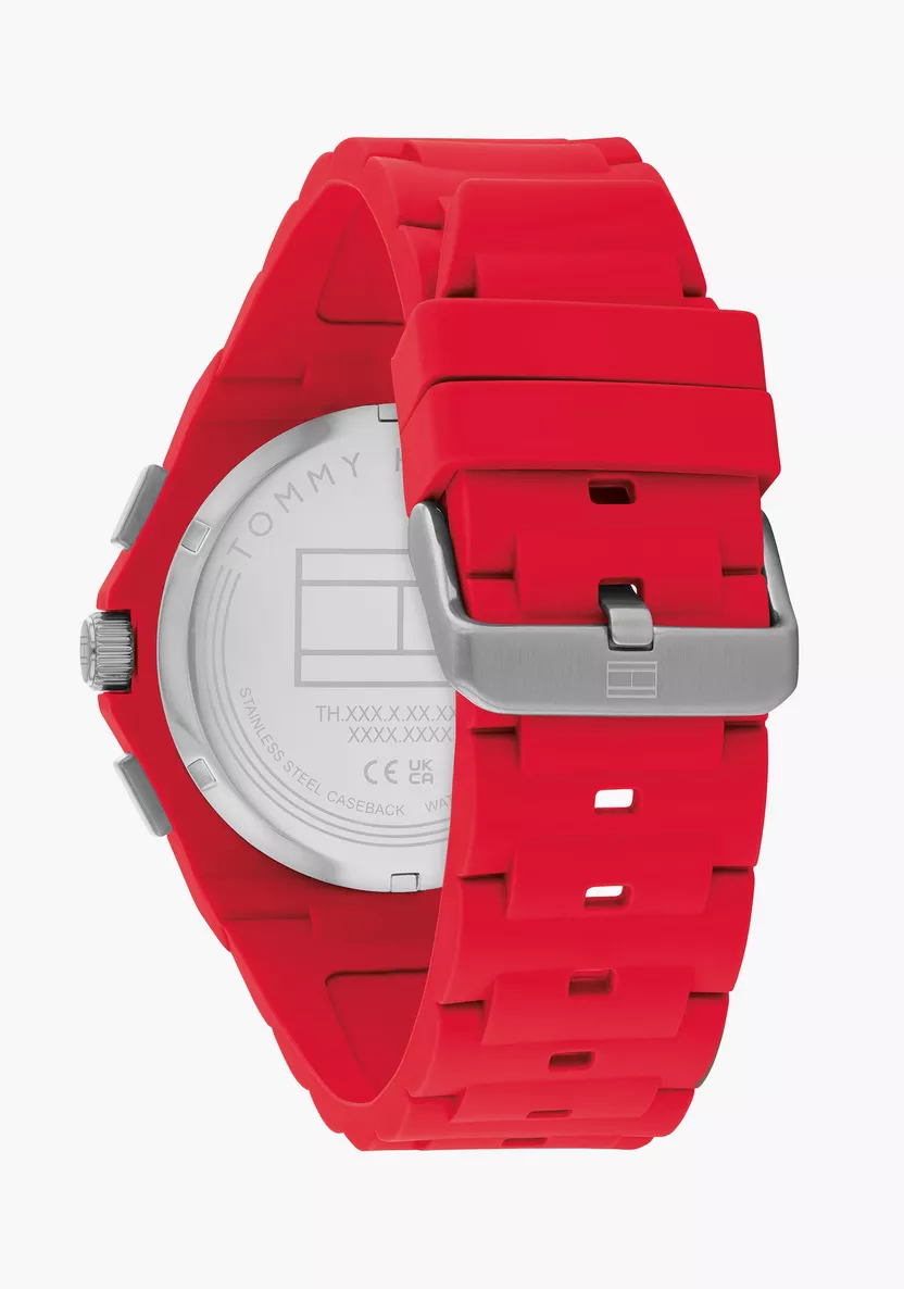 ساعة تومي هيلفيغر للرجال أصلية موديل لون فضي و استيك سليكون مطاط لون احمر.
