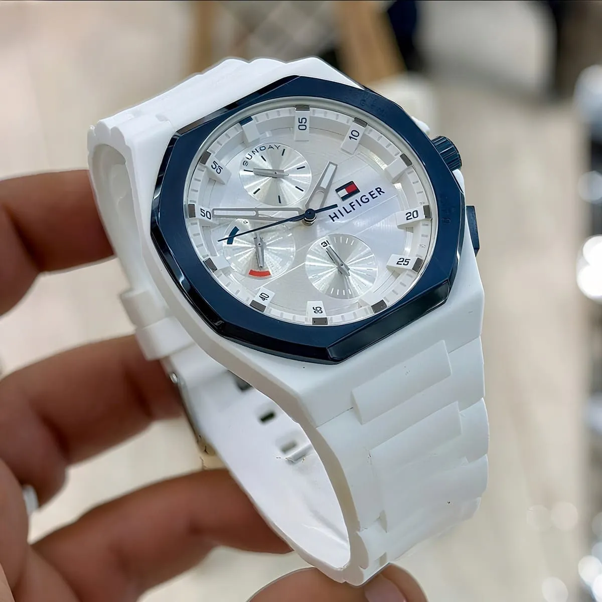 ساعة تومي هيلفيغر للرجال أصلية موديل 1792150لون ابيض و استيك سليكون مطاط لون ابيض.