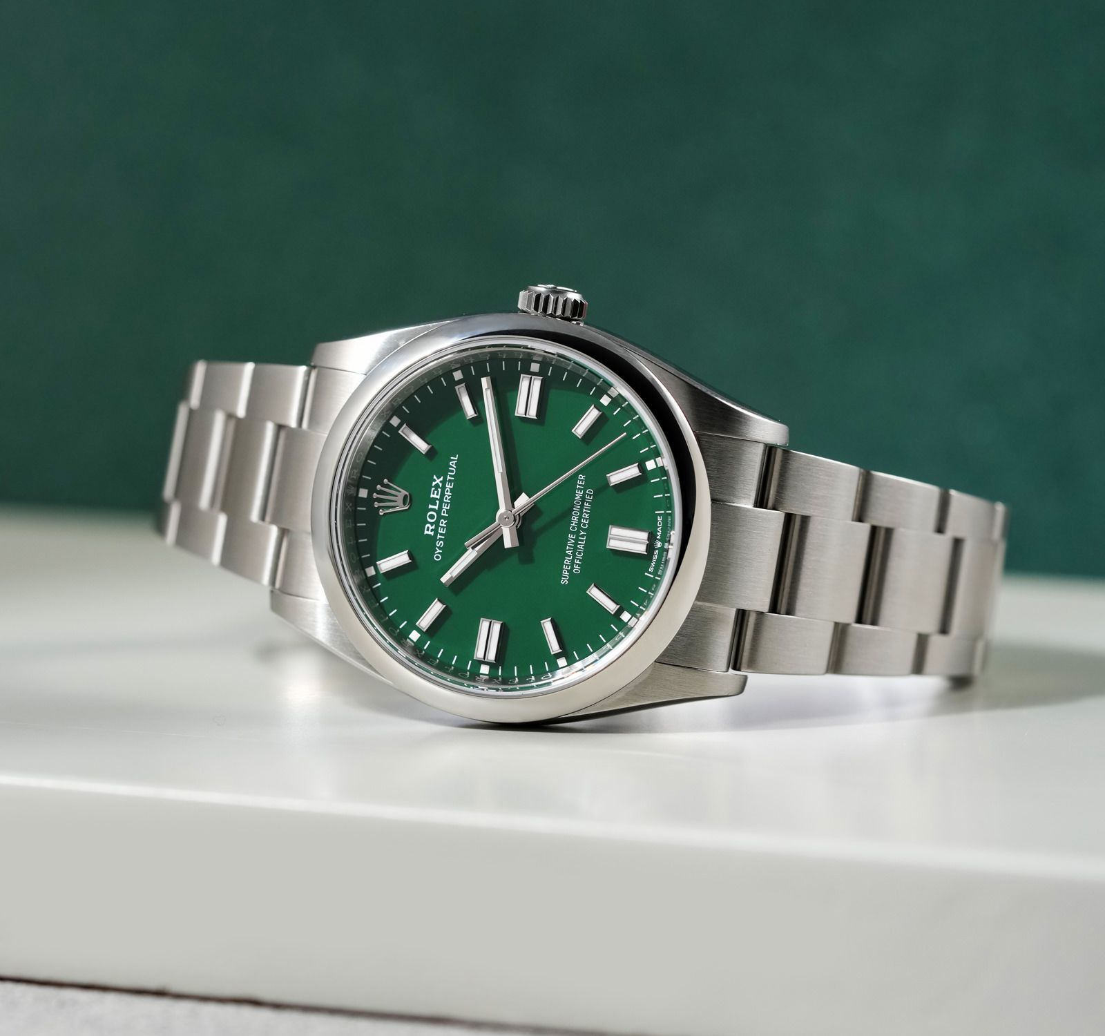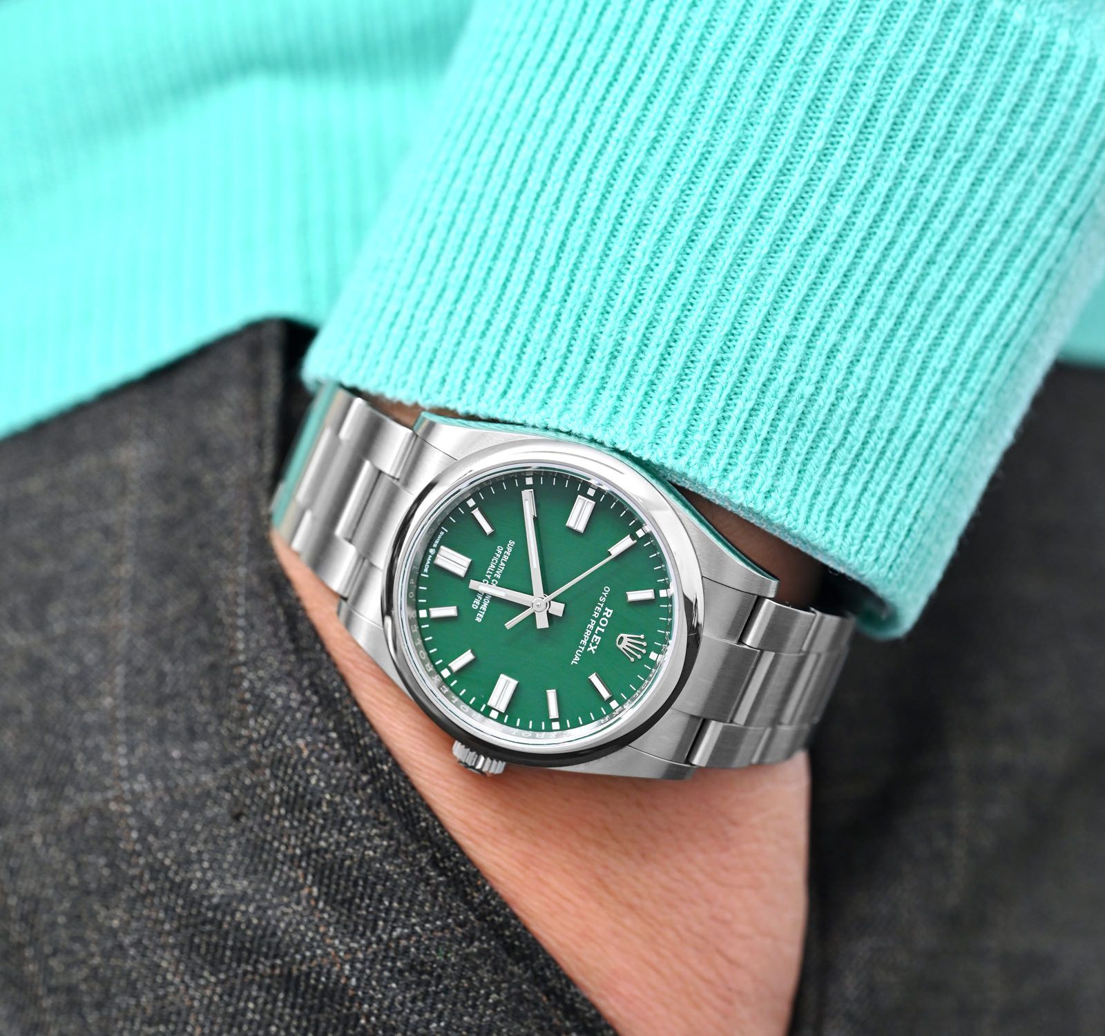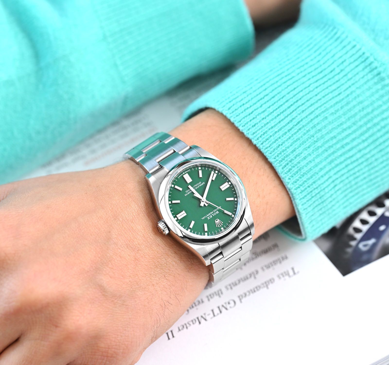 ساعة رولكس Rolex للرجال و النساء (ميرور اوريجنال) موديل Oyster Perpetual 277200-0006 لون اخضر و استيك معدن ستانلس لون فضي.