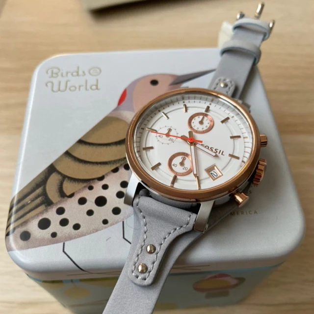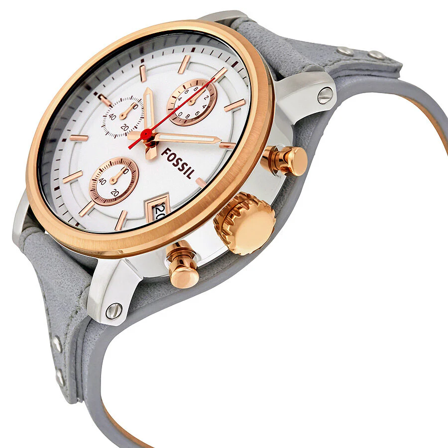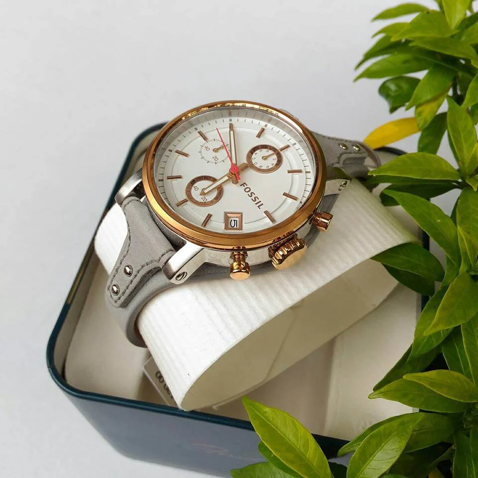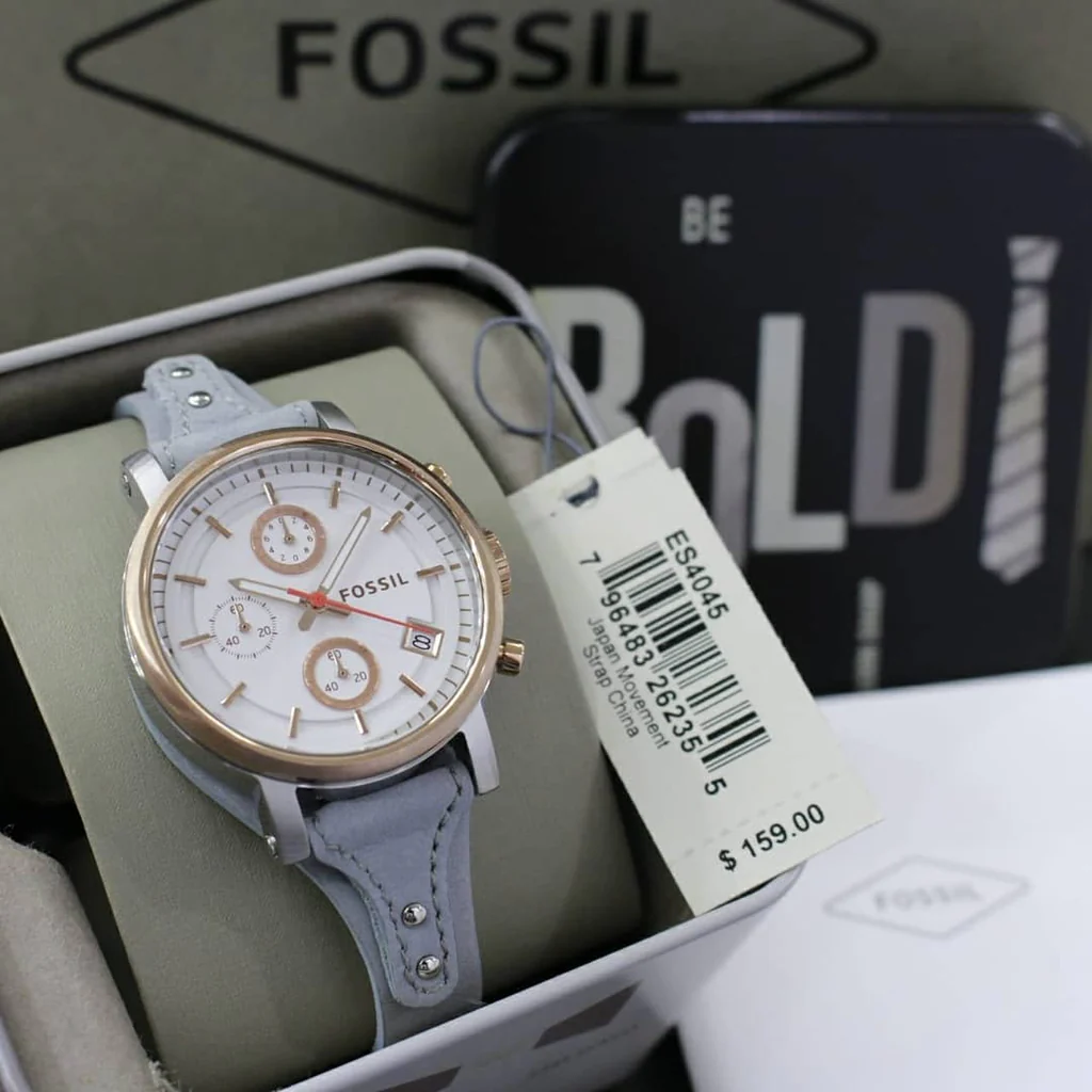 ساعة فوسيل للنساء اصلية موديل ES4045 لون ابيض واستيك معدن ستانلس لون رمادي.