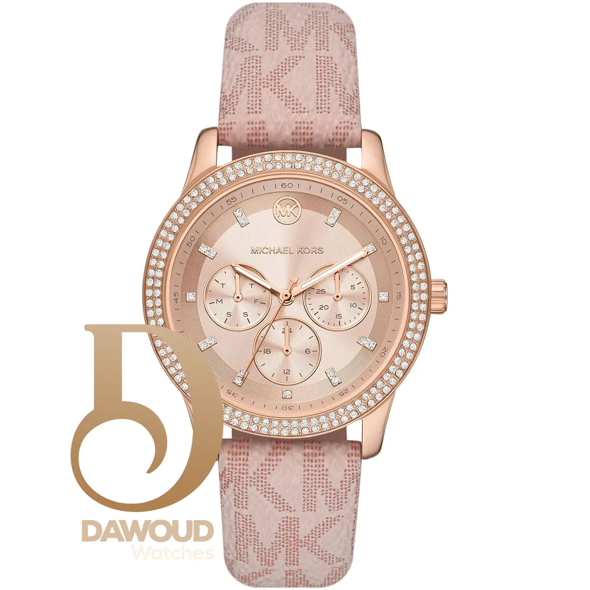 الساعة مزينة بفصوص كريستال و شعار MK