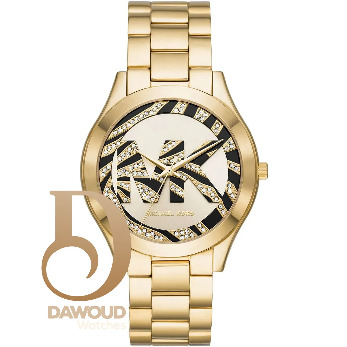 الساعة مزينة بفصوص كريستال و شعار MK ومينا مجعدة على شكل صدفة السلحفاء