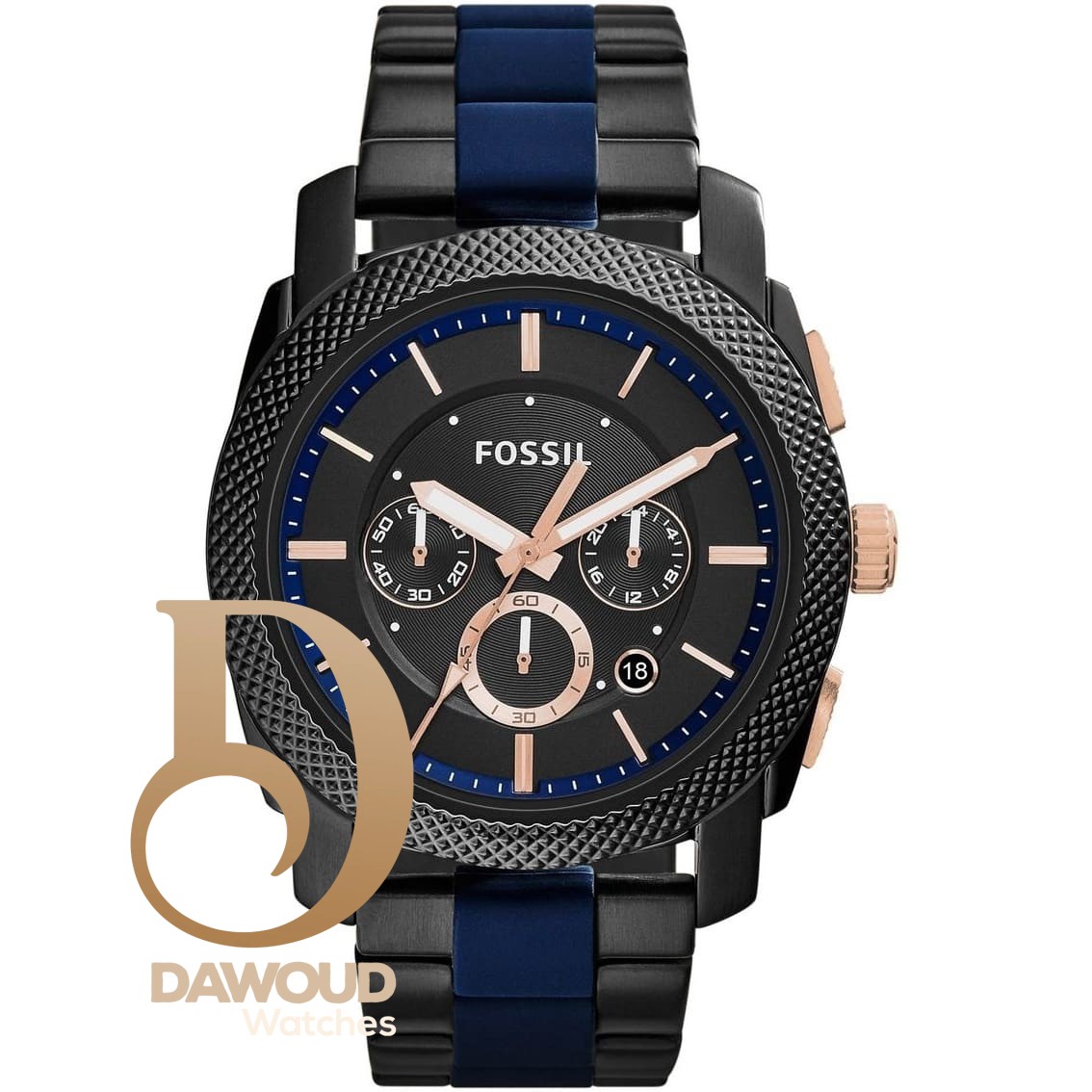 ساعة فوسيل للرجال اصلية موديل (ماشين) Machine FS5164 بلون اسود واستيك معدن بلون اسود وازرق