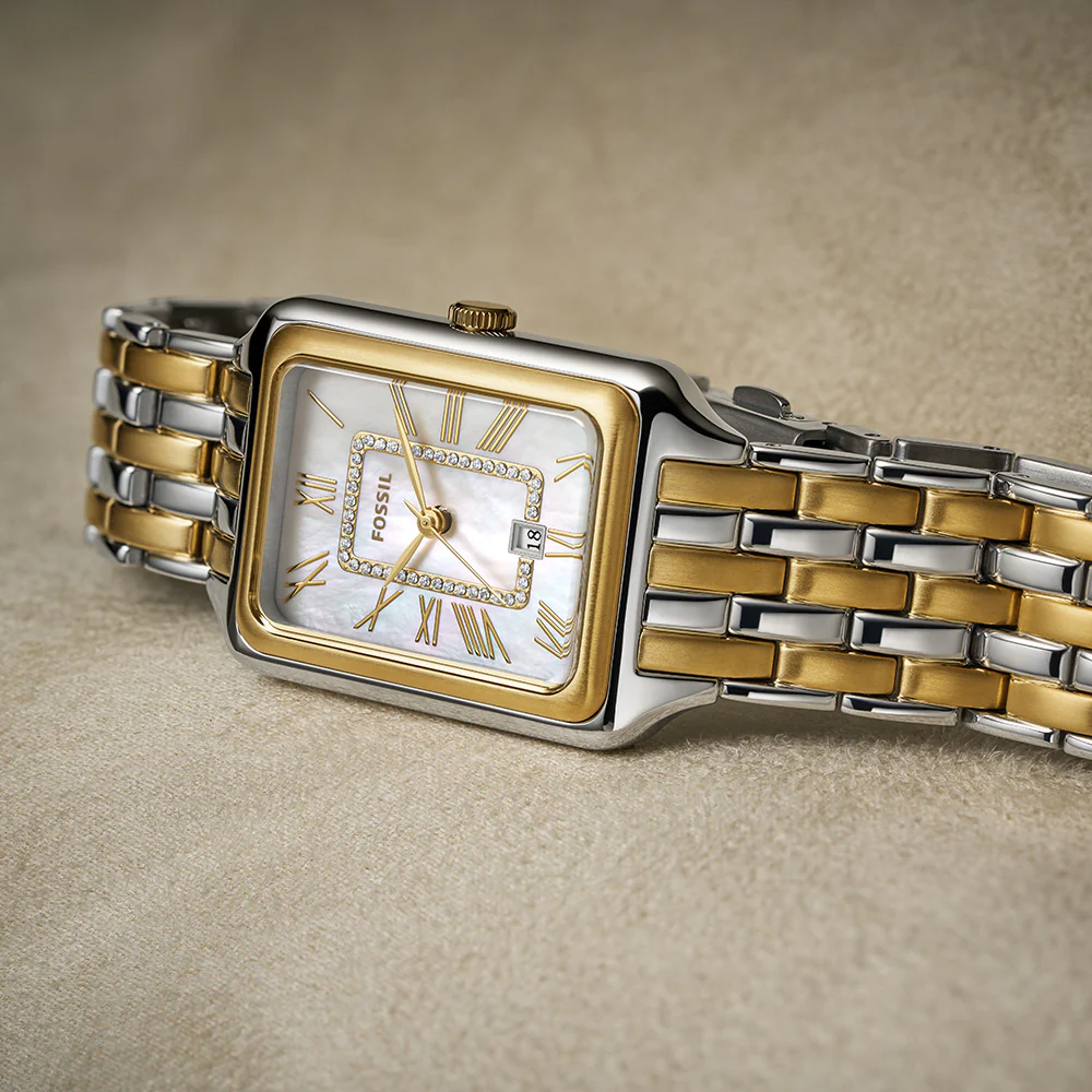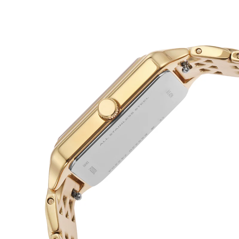 ساعة فوسيل للنساء اصلية موديل لون ابيض واستيك معدن ستانلس لون ذهبي.