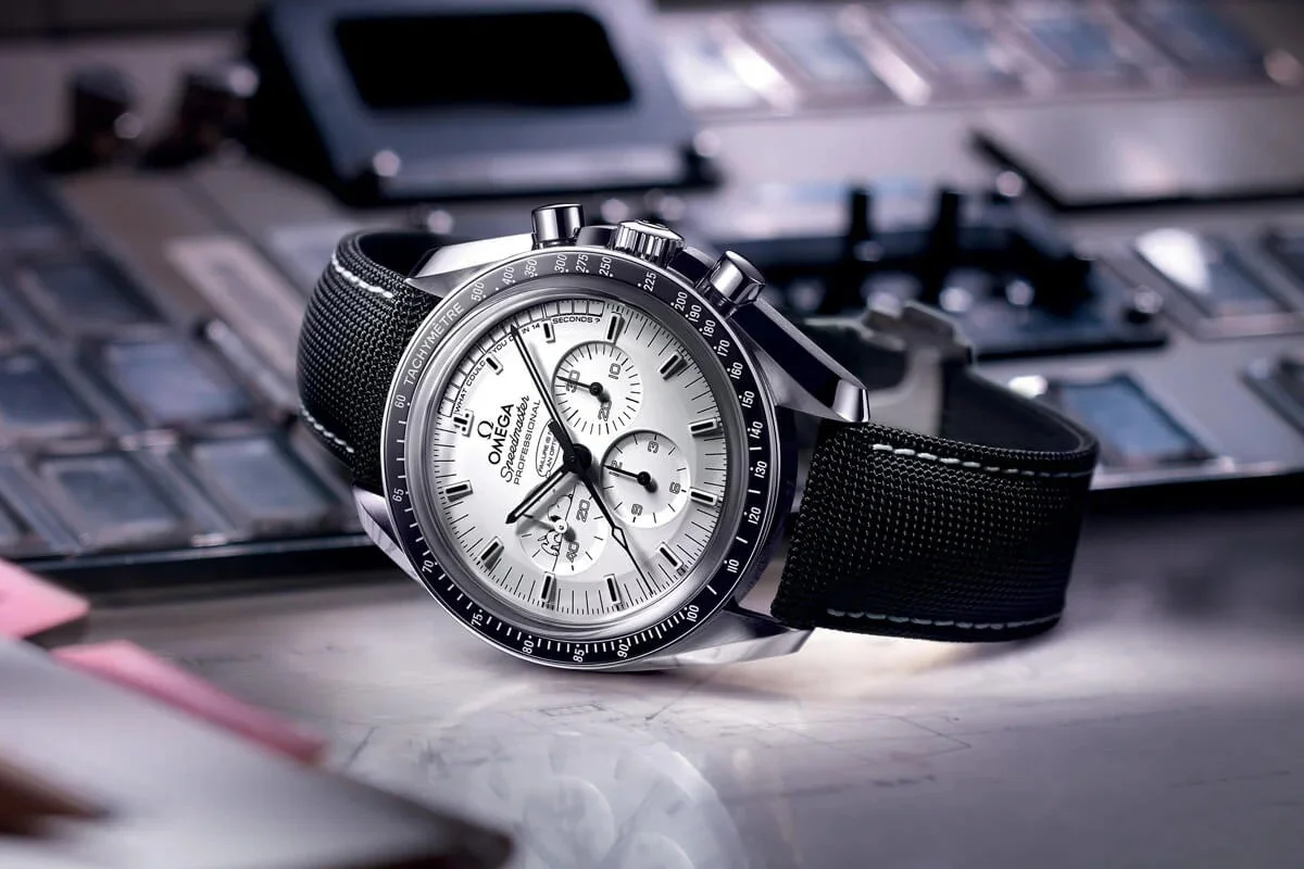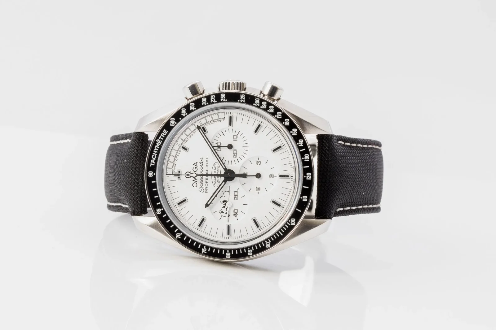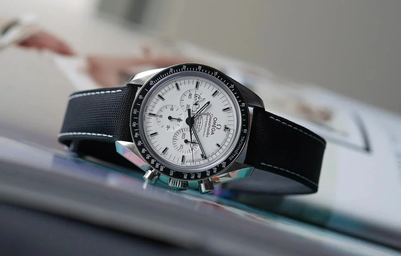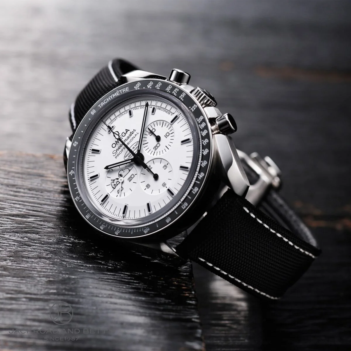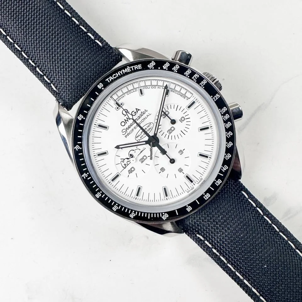 ساعة اوميجا للرجال Omega (ميرور اوريجينال) موديل Speedmaster Professional Moonwatch 311.32.42.30.04.003 لون أبيض و استيك نسيج لون أسود.