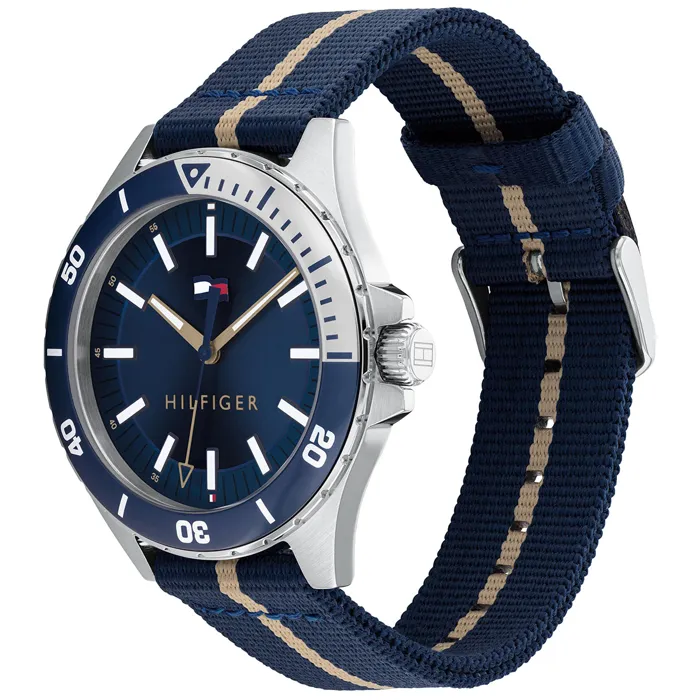ساعة تومي هيلفيغر لوجان 1792011 هي ساعة رجالية أنيقة بهيكل من الفولاذ المقاوم للصدأ بعرض 43 مم وسمك 10 مم باللون الفضي. تتميز هذه الساعة بسوار أزرق من البلاستيك المعاد تدويره بعرض 20 مم عند نقطة التثبيت. الميناء الأزرق لساعة تومي هيلفيغر 1792011 محمي بزجاج معدني. تتمتع الساعة بفئة مقاومة للماء تبلغ 50 مترًا / 5 ضغط جوي، مما يعني أنها تتمتع بمقاومة محدودة للماء (لا يُنصح بالسباحة). يتم توفير ساعات تومي هيلفيغر في عبوة الشركة المصنعة الأصلية وتأتي مع ضمان لمدة عامين.
