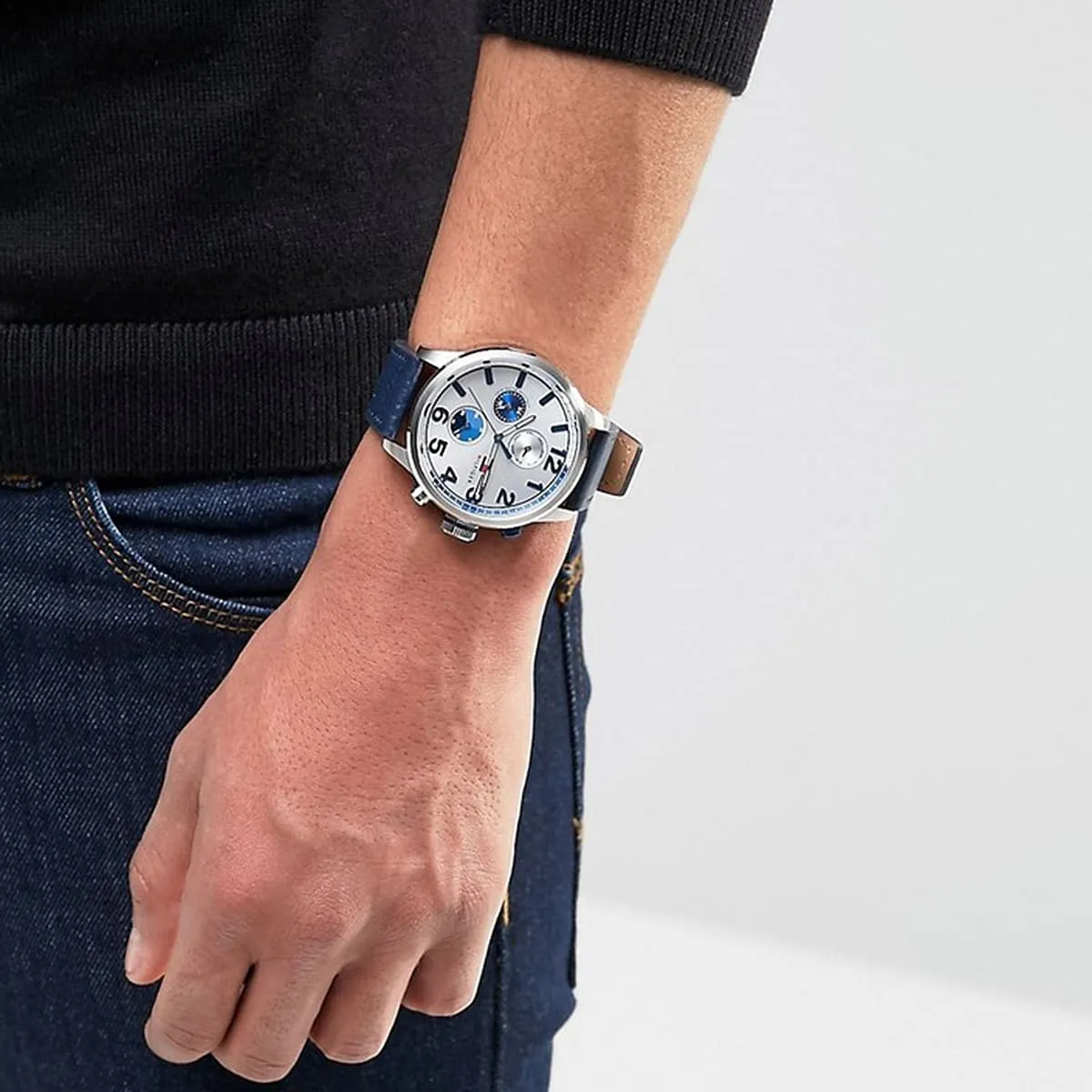 Tommy Hilfiger watch Tommy Hilfiger للرجال أصلية موديل 1791240 Jackson لون فضي و استيك جلد طبيعي لون ازرق.