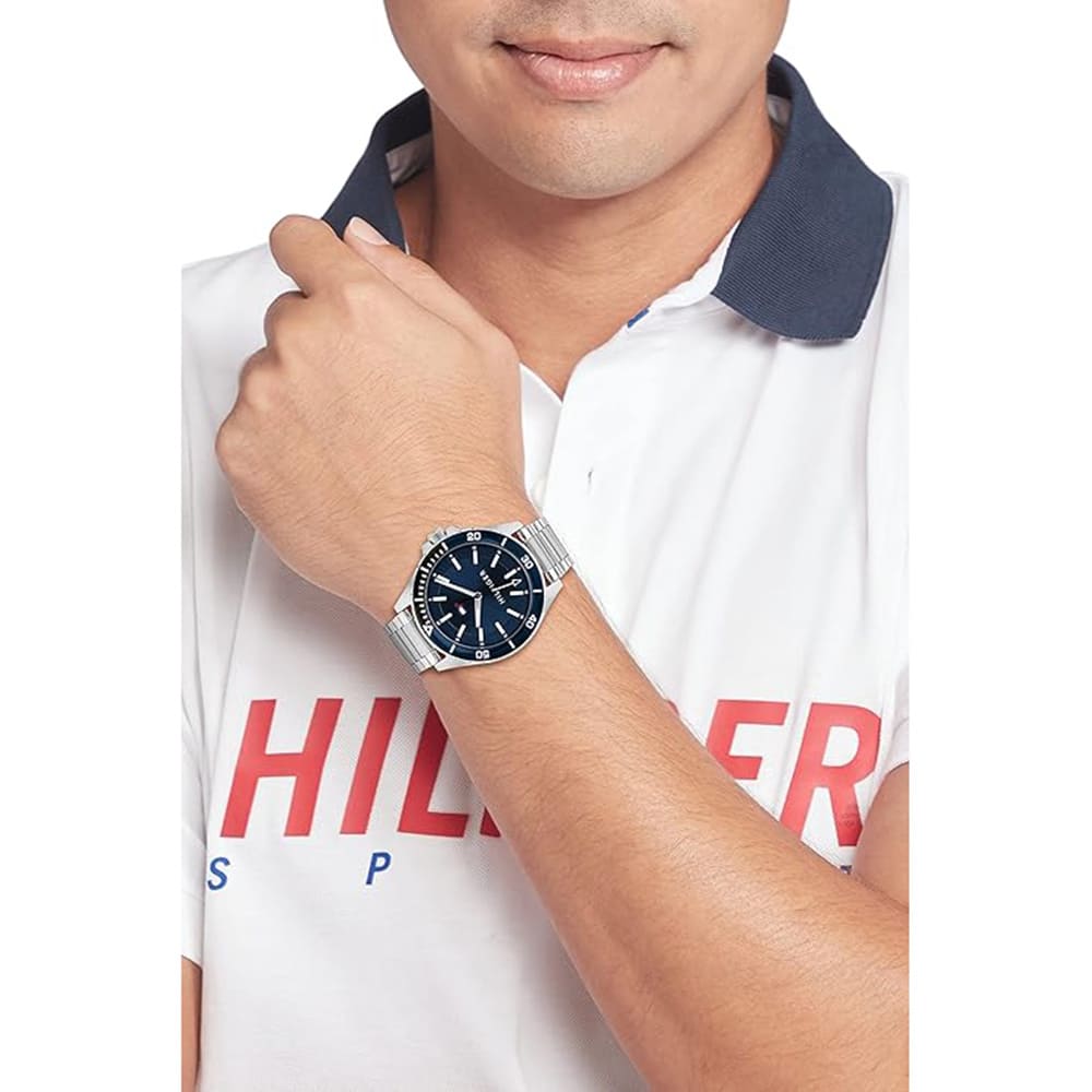 Tommy Hilfiger watch Tommy Hilfiger للرجال أصلية موديل 1792012 لون ازرق و استيك معدن ستانلس ستيل لون فضي.