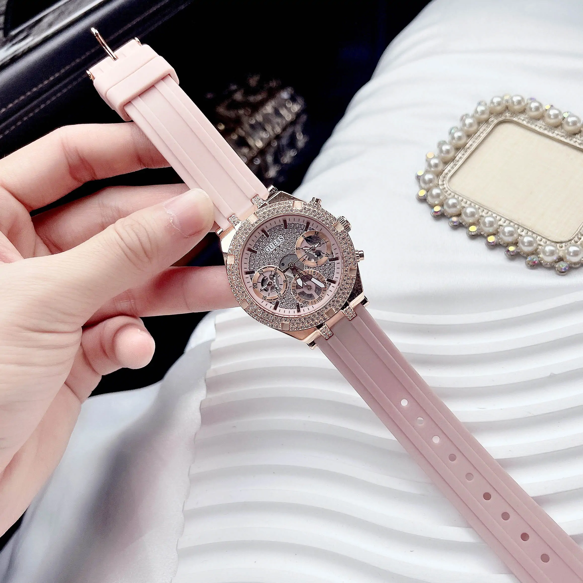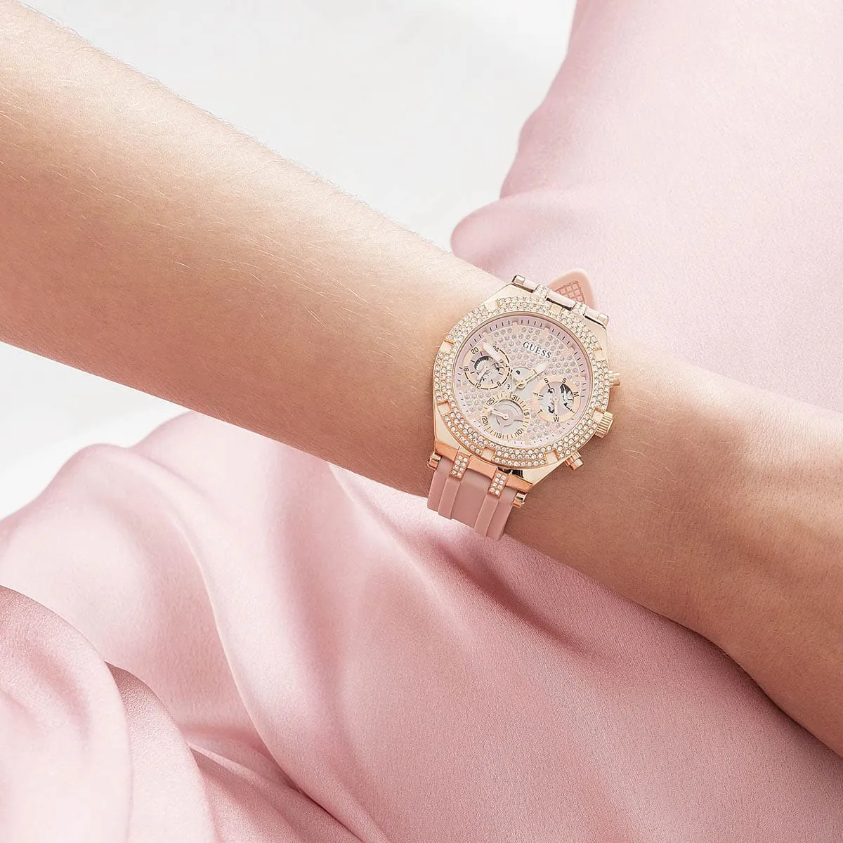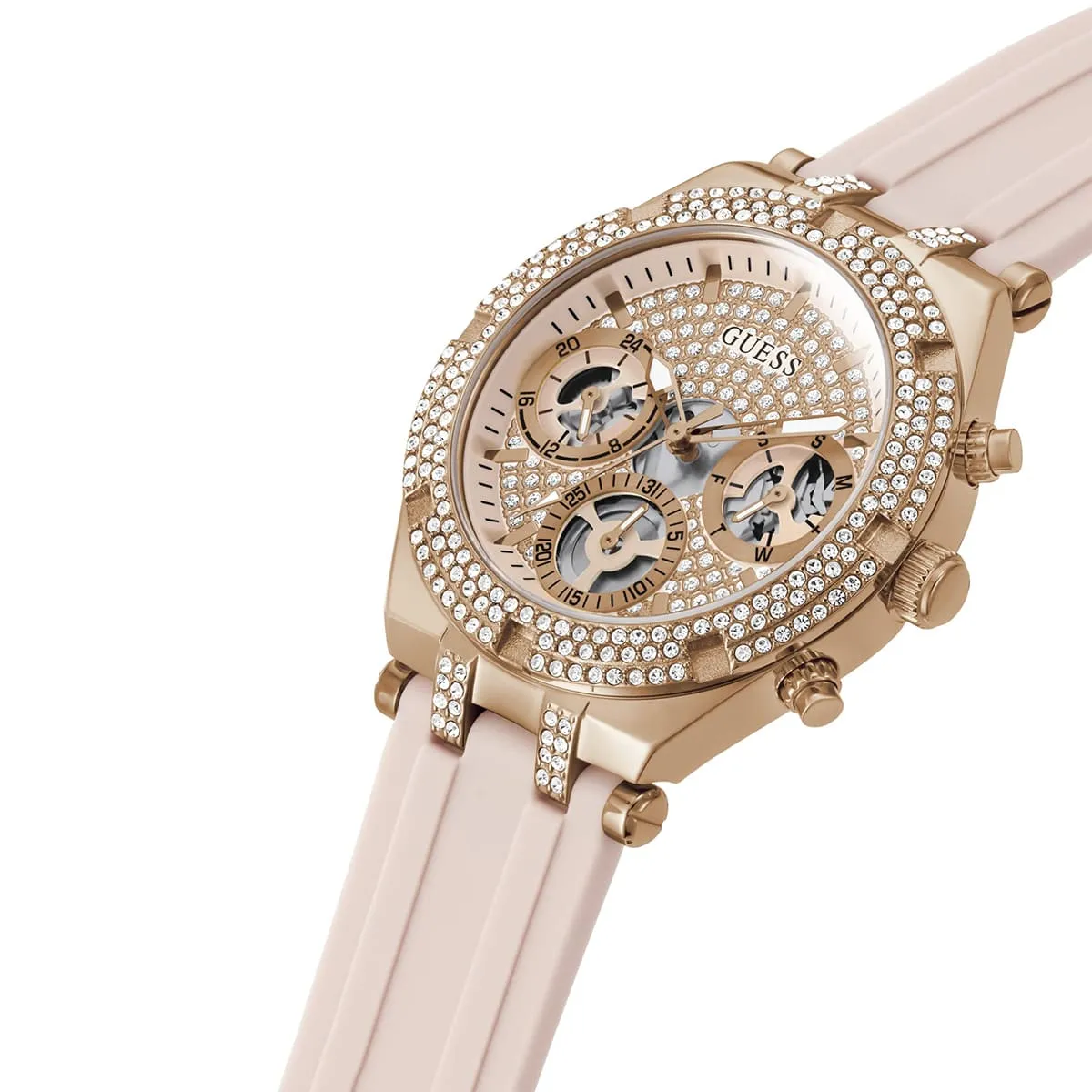 Jess's watch Guess For women original model Heiress GW0407L3 لون روز جولد و استيك سيليكون مطاط لون وردي.