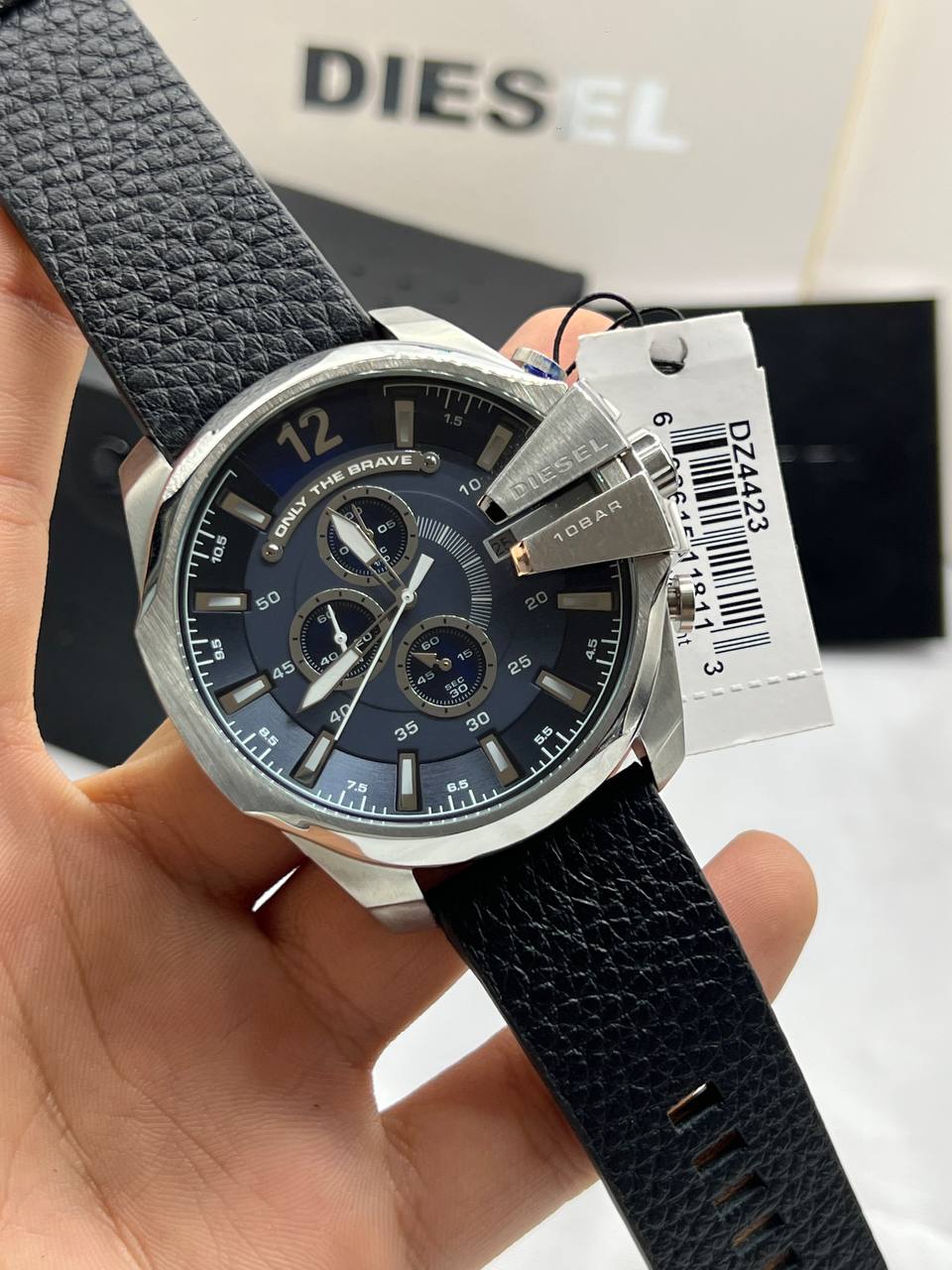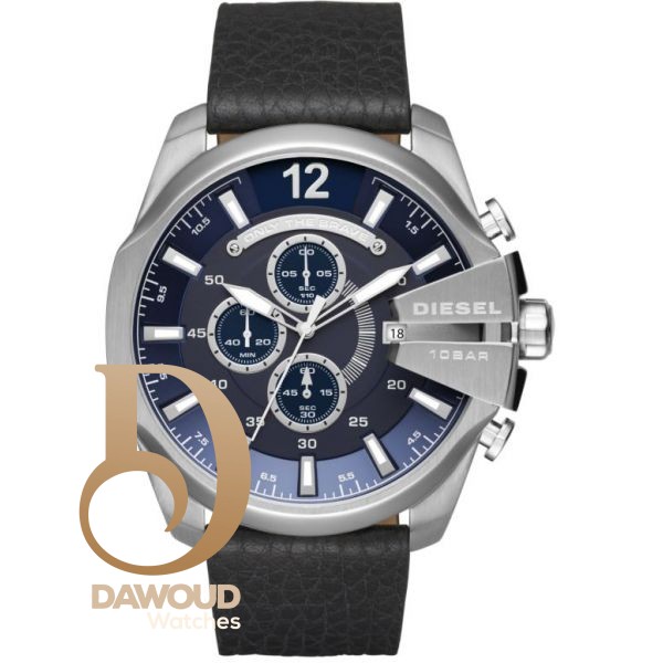 Diesel watch Diesel للرجال أصلية موديل Mega Chief DZ4423 لون ازرق و استيك جلد طبيعي لون اسود.
