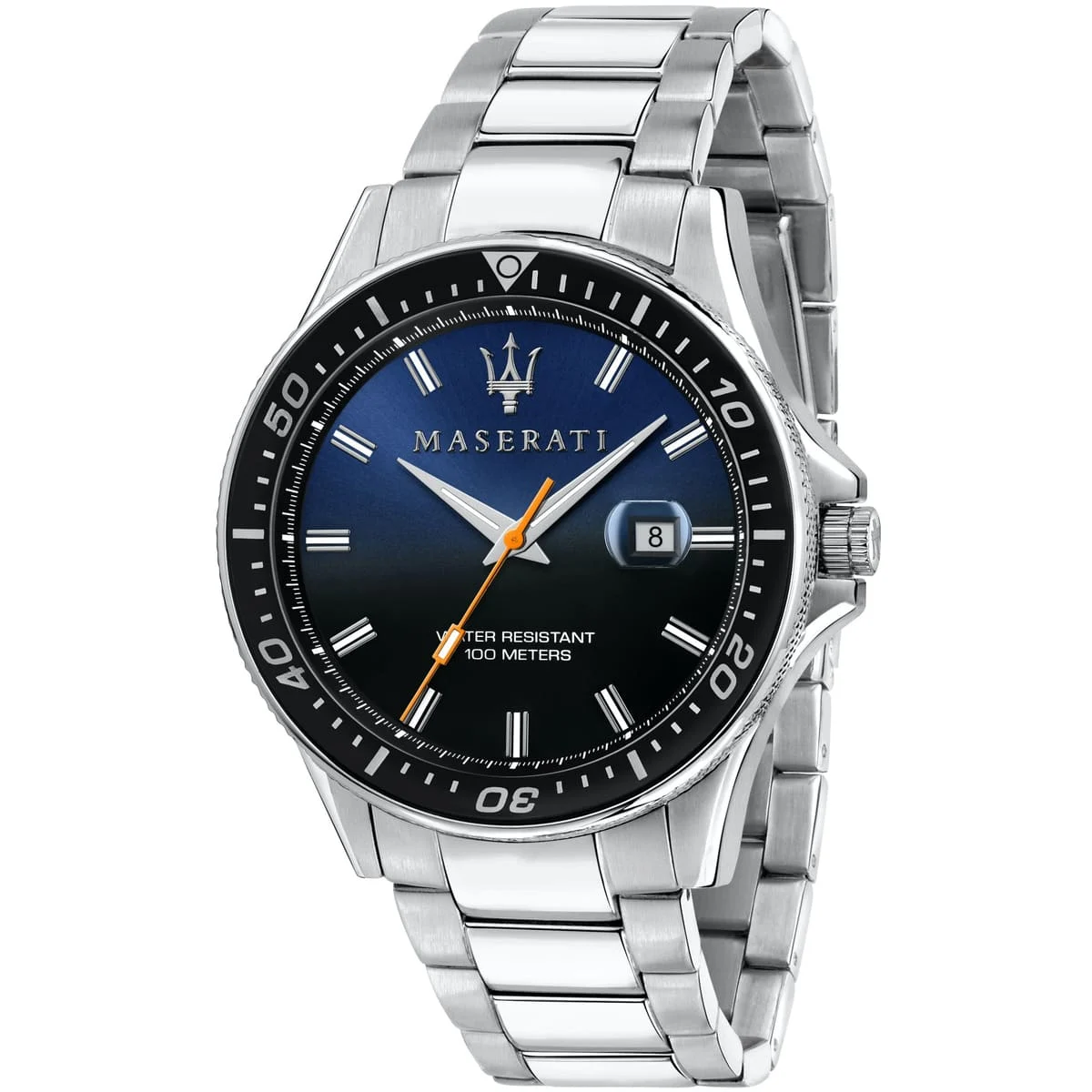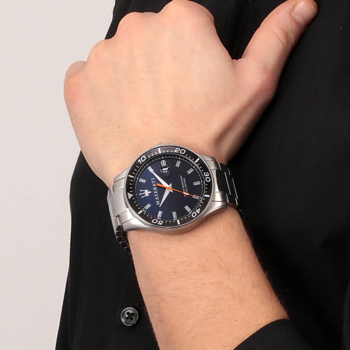 ساعة مازيراتي رجالي أصلية موديل (سفيدا) R8853140001 Sfida بلون اسود و ازرق و استيك معدن ستانلس ستيل بلون فضي