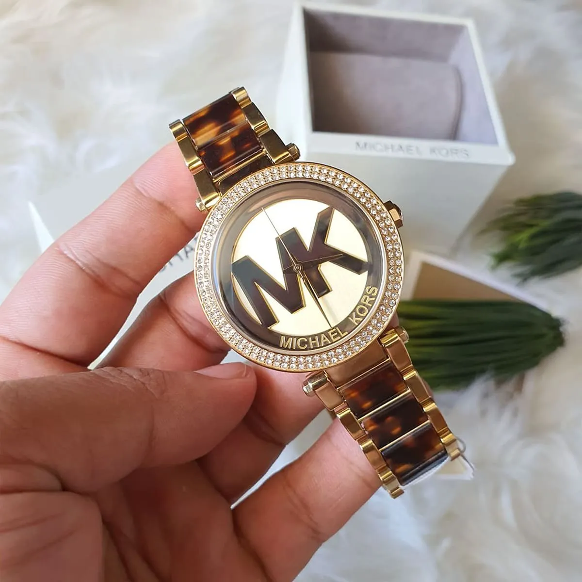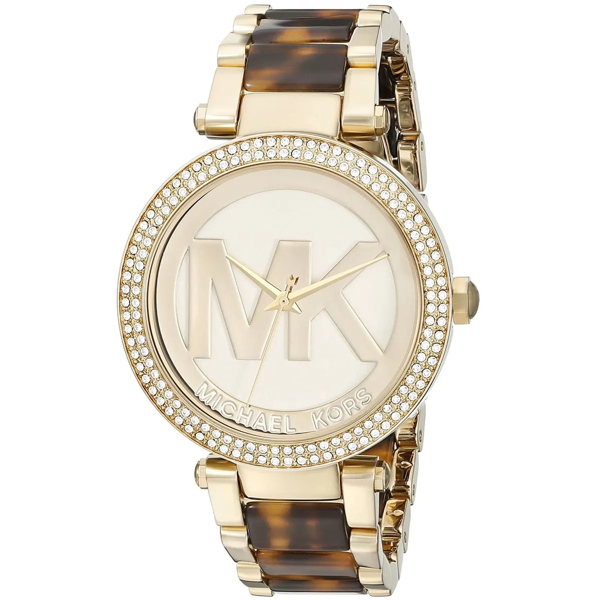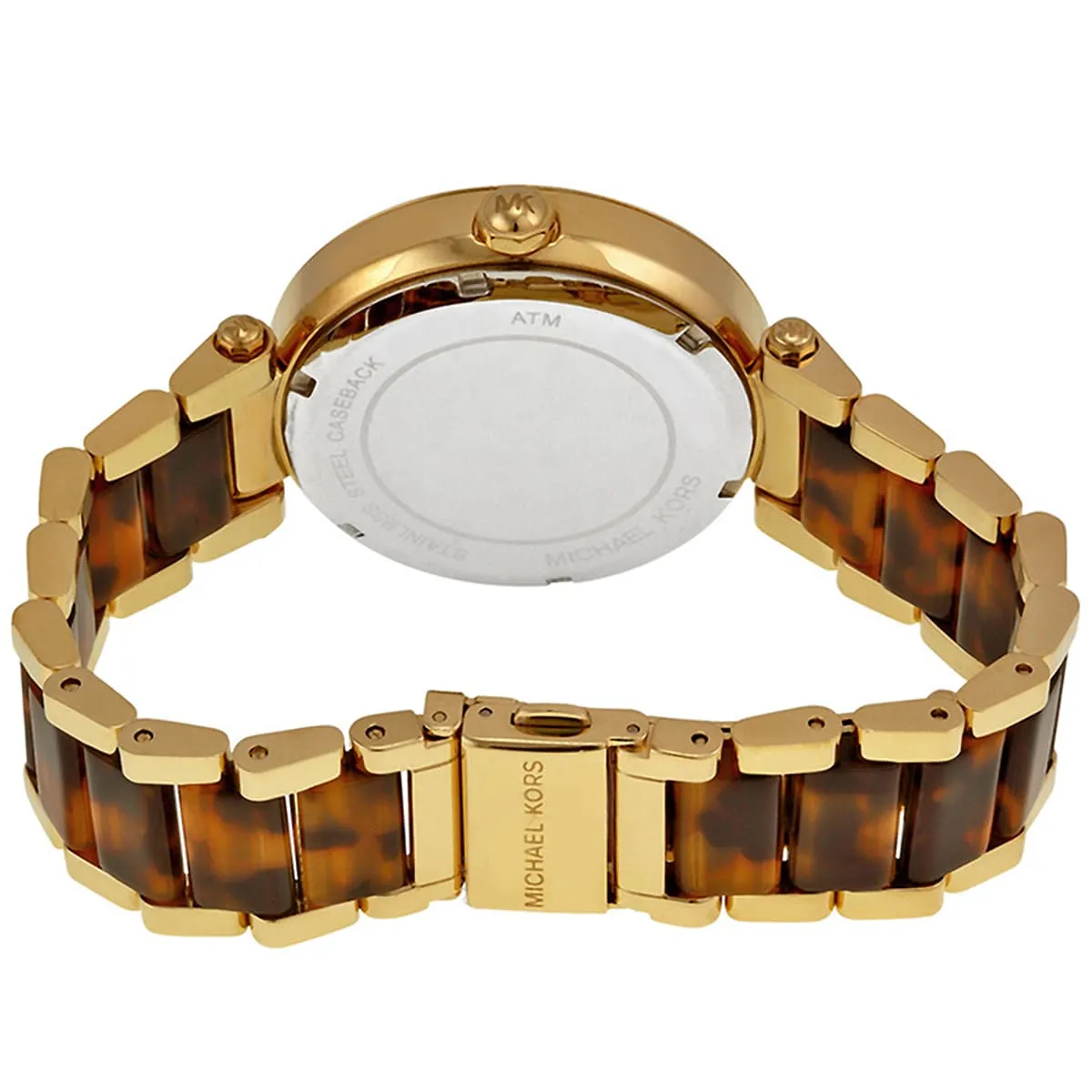 الساعة مزينة بشعار MK و استيك مجعد على اشكال صدفة السلحفاء