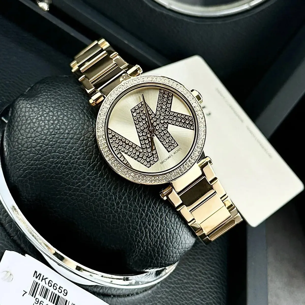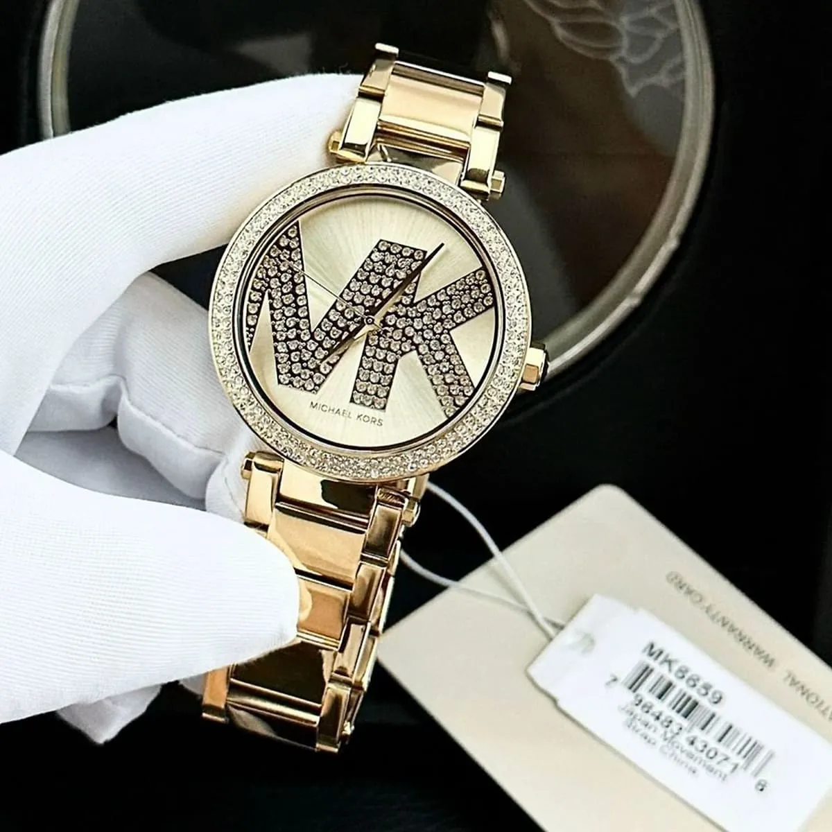 الساعة مزينة بفصوص كريستال و شعار MK