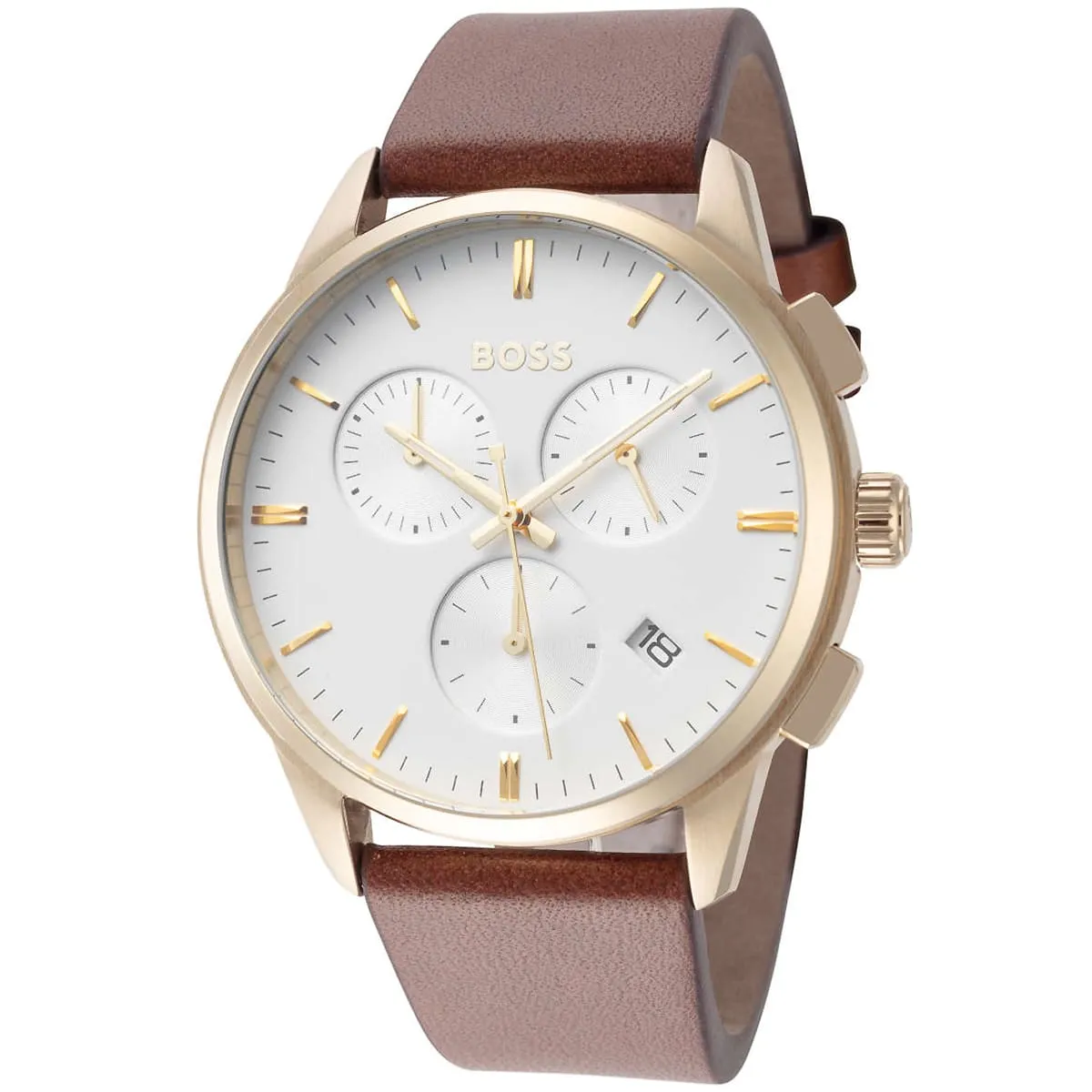 Hugo Boss watch Hugo Boss للرجال أصلية موديل 1513926 Dapper لون ابيض و استيك جلد طبيعي لون بني.