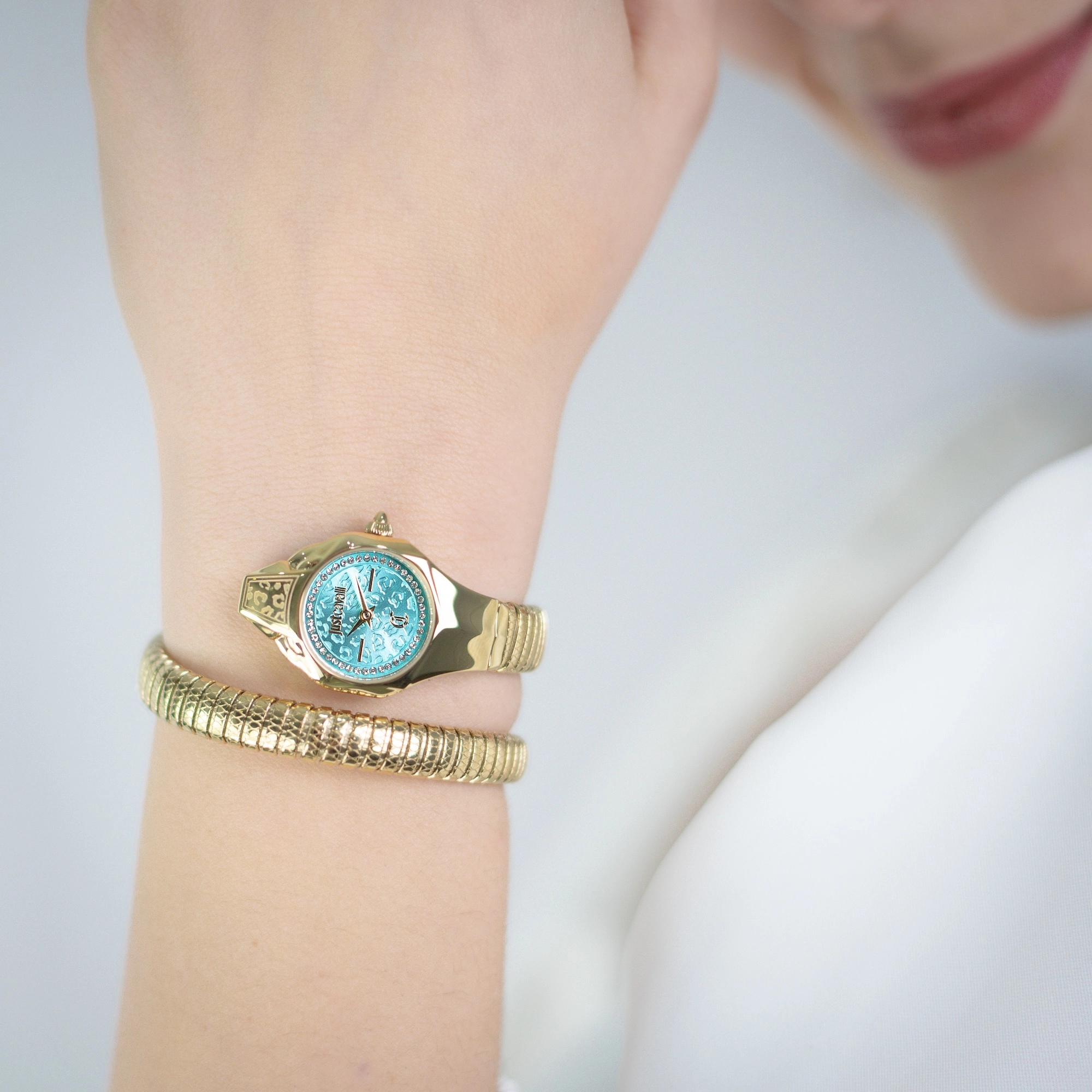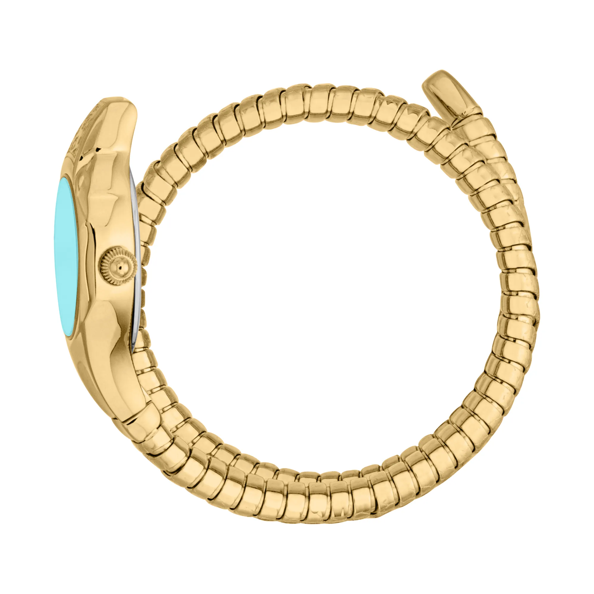 Bold, fierce, and ultra-glam: this Snake watch is made for those who love to stand out. The gold-tone wrap-around design coils around the wrist like a snake, creating an instant wow effect. The turquoise dial, featuring an embossed animalier pattern, bursts with color, while the crystal-studded bezel adds just the right amount of sparkle. A perfect mix of luxury and pop attitude, designed for those who own their style with confidence and edge.