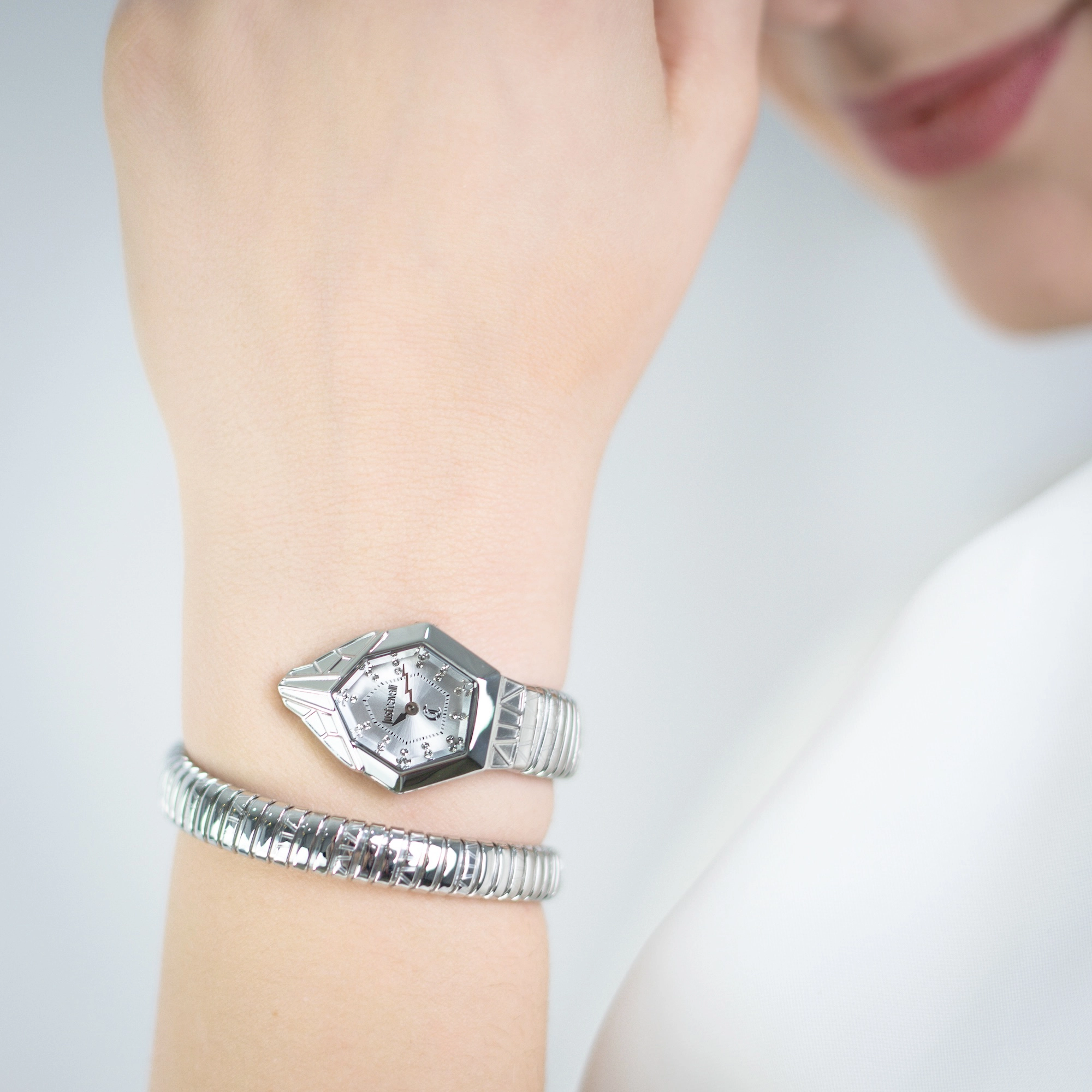 A bold and futuristic interpretation of the serpent motif comes to life in a geometric and edgy design. The polished stainless steel double-wrap bracelet coils elegantly around the wrist, while the engraved details along its surface enhance the strong character of this creation. The hexagonal case, inspired by the texture of scales, encloses a silver sunray dial adorned with crystal indexes that add a touch of refined brilliance. The fusion of architectural lines and metallic finishes makes this model a true icon of modern style, perfect for those who seek a distinctive and unconventional accessory.