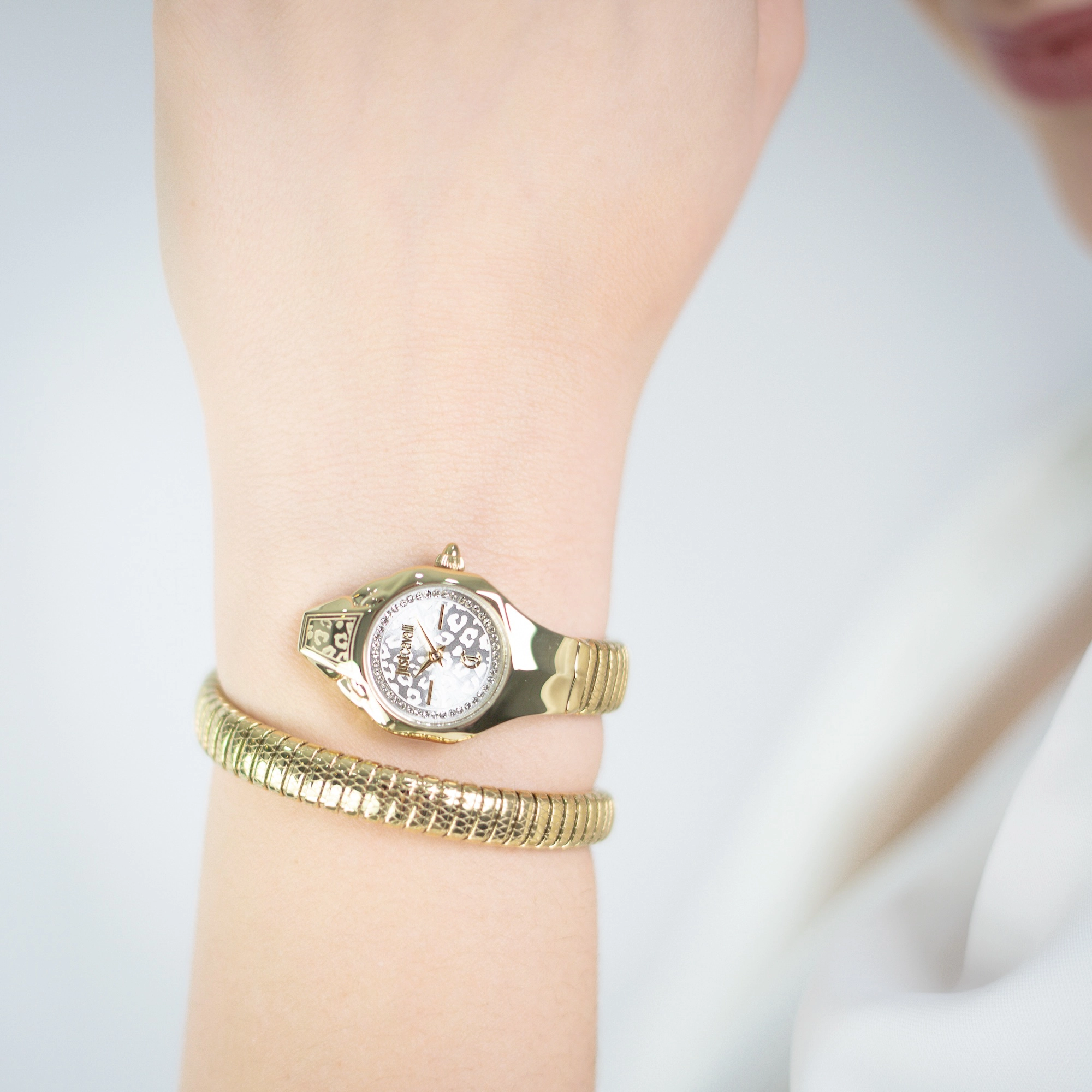 An irresistible blend of elegance and boldness. The white dial with a tone-on-tone animalier pattern creates a sophisticated and dynamic effect, framed by a sparkling row of crystals that enhance its radiance. The gold-plated hexagonal case stands out with engraved details and sharp lines, while the flexible spiral bracelet, featuring a finish inspired by the texture of snake scales, wraps around the wrist with natural grace and sensuality. A timepiece designed for those who love to stand out with style and character.