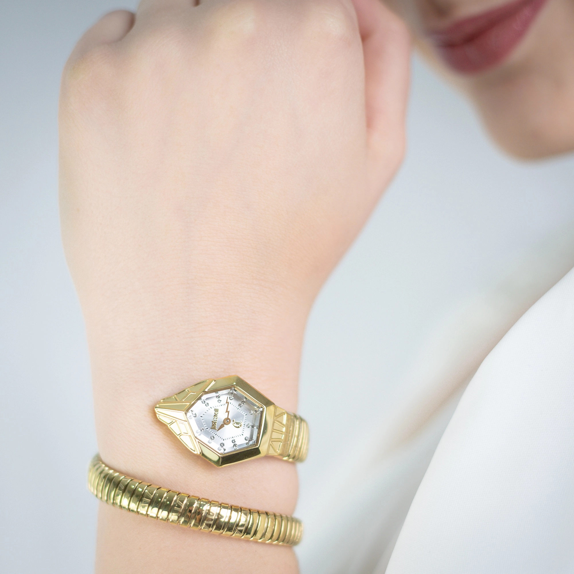 A bold design that reinterprets the serpent motif with sharp lines and precious details. The polished gold-tone double-wrap bracelet coils elegantly around the wrist, while the geometric engravings on the surface create a refined interplay of texture and reflections. The hexagonal case, inspired by the structure of scales, frames a silver sunray dial adorned with crystal indexes that add brilliance and depth. The perfect balance between futuristic design and glamorous details makes this watch a distinctive accessory, designed for those who dare to stand out with style.
