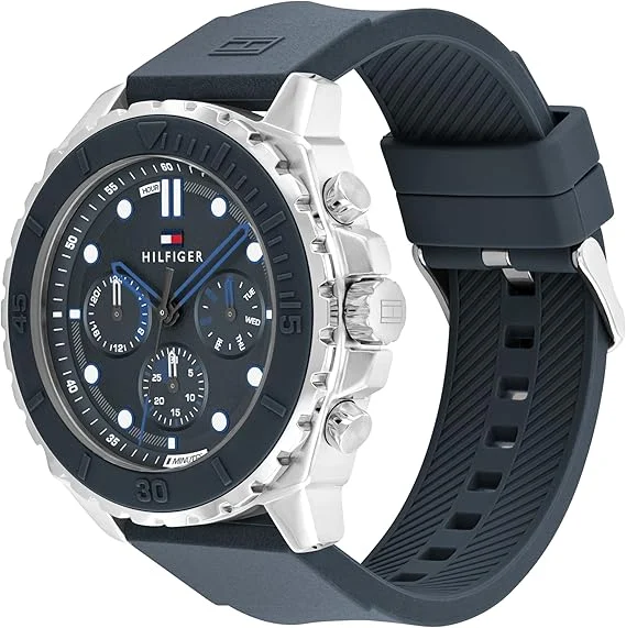 - 48 MM STAINLESS STEEL CASE WITH SLATE BLUE SILICONE Bezel – Robust and masculine design with a thickness of 13.7 mm, bringing a sporty and modern touch to the watch Tommy Hilfiger